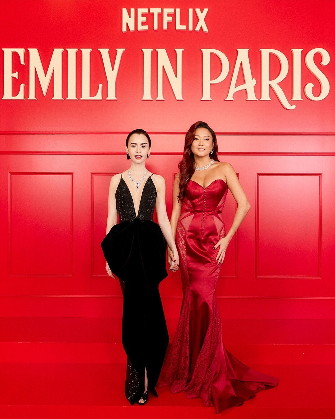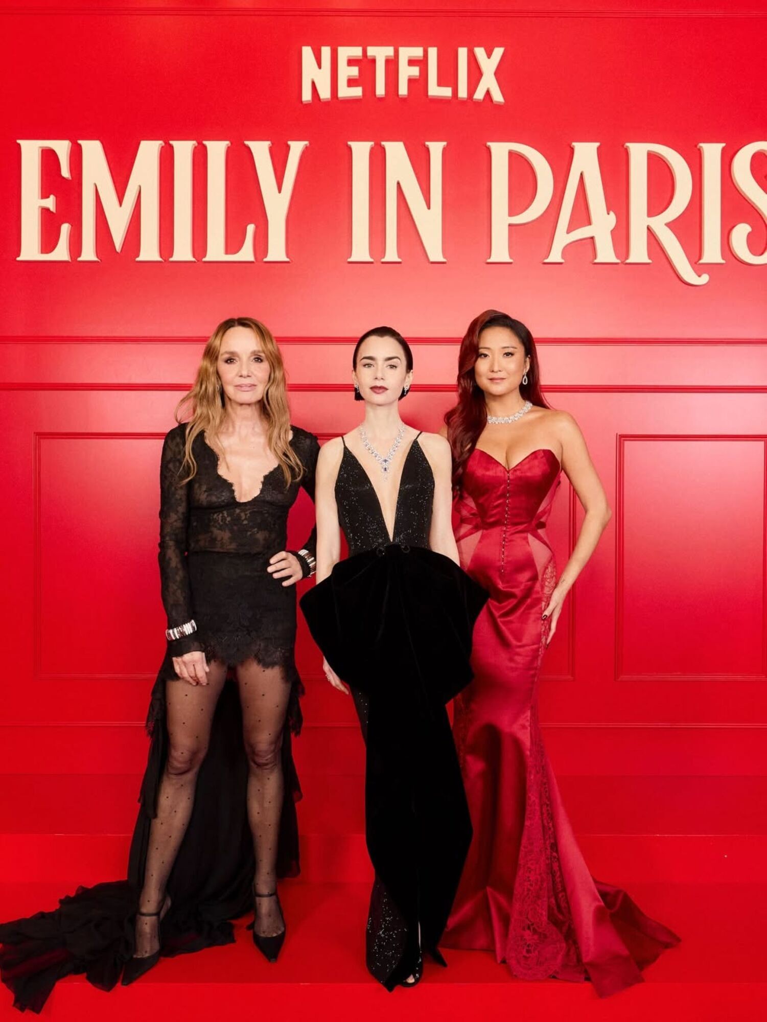 Компанію Коллінз на червоній доріжці склала 34-річна американська актриса Ешлі Парк – вона грає в серіалі найкращу подругу Емілі. Парк обрала для прем'єри "сексуальну червону сукню без бретель" із корсетним верхом і довгою мереживною спідницею.