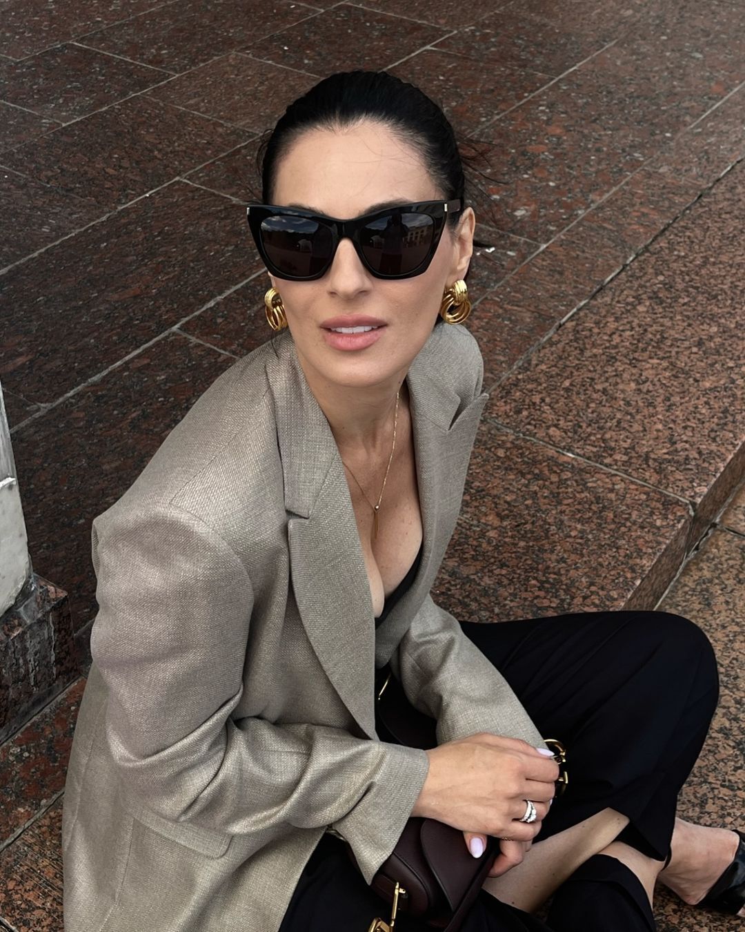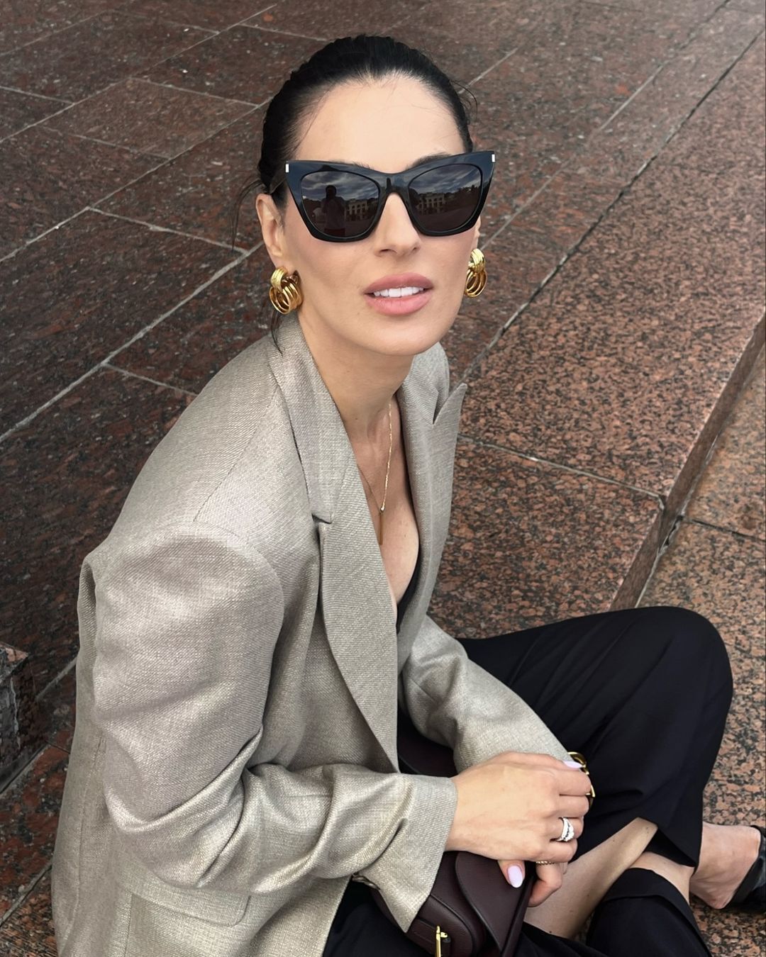 Вона одягла подовжений світло-сірий жакет, чорні штани й босоніжки на високих масивних "золотих" підборах. Образ доповнила клатчем, великими сережками із жовтого металу й об'ємними сонцезахисними окулярами.