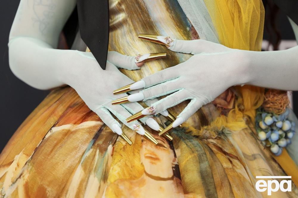Свій образ співачка доповнила пудрово-блакитними прозорими рукавичками з акриловими наклейками на кінчиках довгих нігтів.