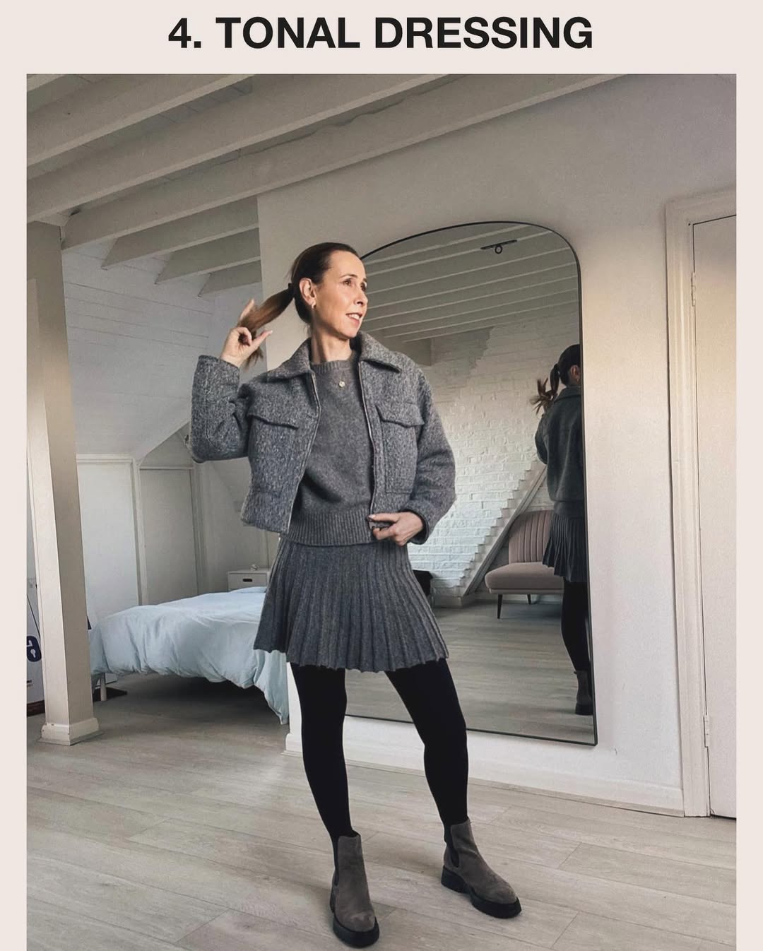 Блогерка поєднала сірий джемпер із в'язаною спідницею з візерунком і курткою в тон.