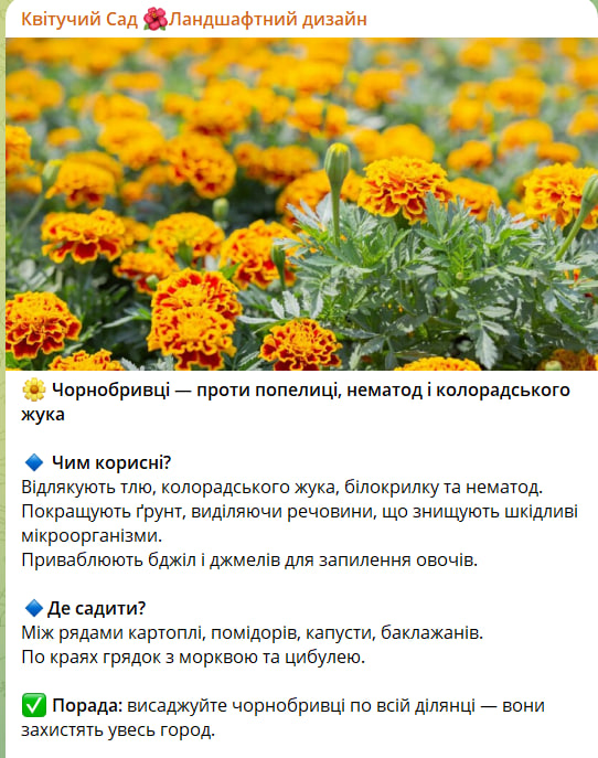 Авторка українського Telegram-каналу "Квітучий сад. Ландшафтний дизайн" 12 травня розповіла, що чорнобривці можна висаджувати на городі для захисту рослин від попелиці, нематодів і колорадського жука.