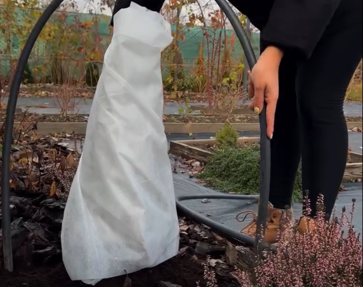 Авторка наголошує, що агроволокно не має торкатися пагонів, щоб рослина не запріла. За бажанням додатково можна накрити кущ хвойними гілками чи соломою, а вже потім зафіксувати укриття.