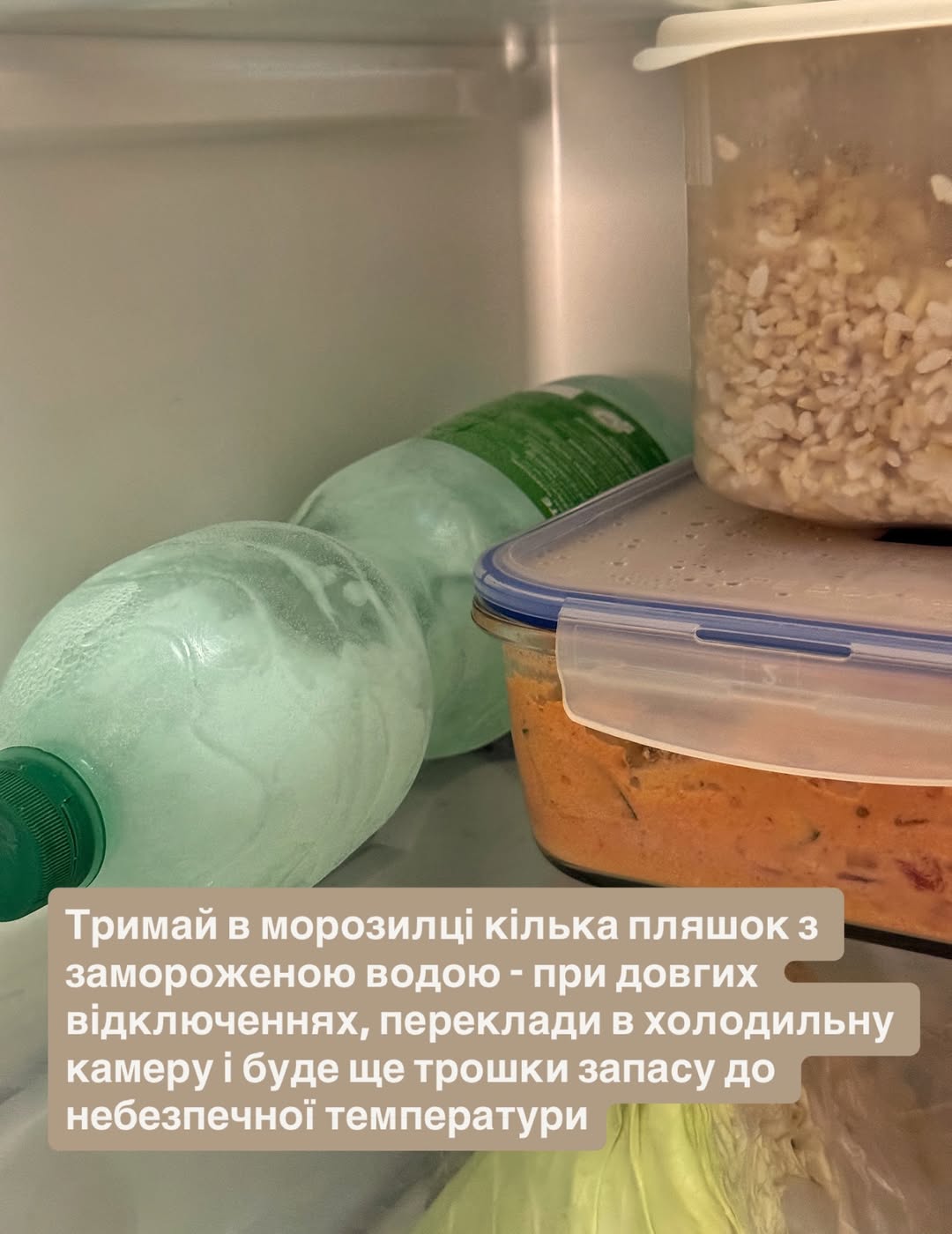 Також фудблогерка порекомендувала зберігати в морозильній камері пляшки із замороженою водою. Під час тривалих вимкнень їх можна буде перекласти в холодильну камеру.
