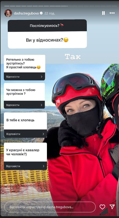 Українська актриса Дар'я Трегубова 14 січня, відповідаючи на запитання фоловерів в Instagram Stories, розмістила фото, на якому позує зі своїм бойфрендом.
