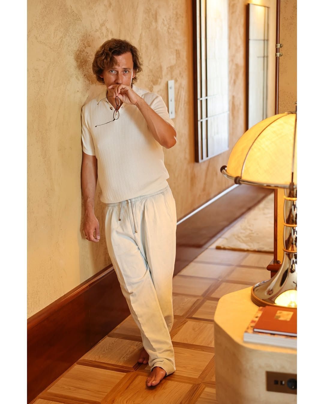 Галкін вибрав для зйомки кремову теніску і штани вільного крою в тон. Позуючи в кадрі, він сперся плечем на стіну.