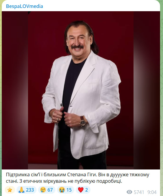 "Підтримка сім'ї та близьким Степана Гіги. Він у дуже тяжкому стані. З етичних міркувань не публікую подробиці", – написав Беспалов.
