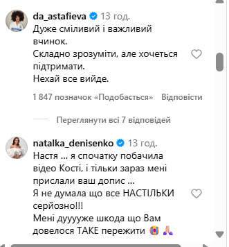 Соловйову в коментарях до поста підтримали українські артистки Даша Астаф'єва, Наталка Денисенко, а також ведуча Аліна Доротюк.
