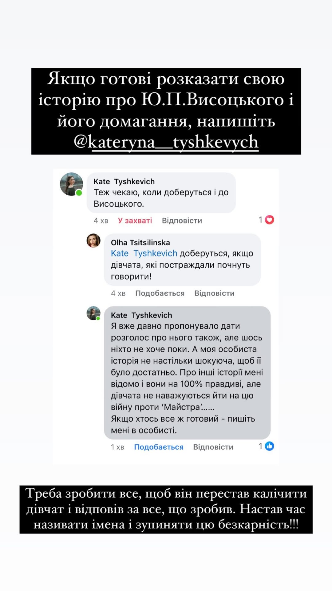 "Якщо готові розказати свою історію про Юрія Висоцького і його домагання, напишіть Катерині Тишкевич", – ідеться в пості.