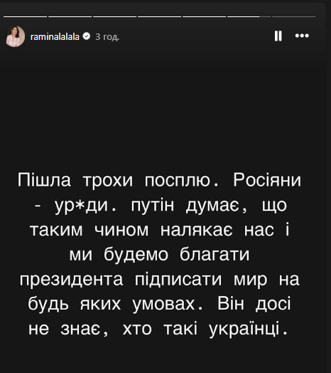 "Росіяни – уроди. [Нелегітимний президент країни-агресора РФ Володимир] Путін думає, що таким чином налякає нас і ми будемо благати президента підписати мир на будь-яких умовах. Він досі не знає, хто такі українці", – написала вона.