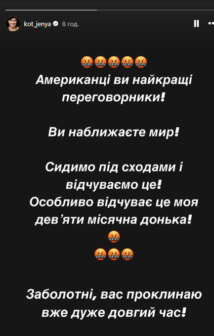"Американці, ви "найкращі" переговорники. Ви наближаєте мир. Сидимо під сходами й відчуваємо це. Особливо відчуває це моя дев'ятимісячна донька", – заявив він.