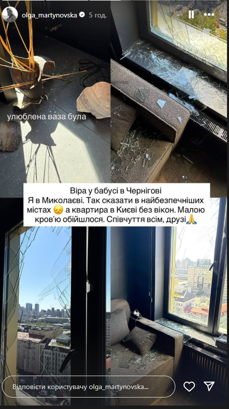 У день виходу інтерв'ю Мартиновська в Instagram Stories розповіла, що її квартира зазнала пошкоджень під час нічної масованої атаки російських окупантів на столицю. Мартиновська додала, що під час нічної атаки ані її, ані дочки вдома не було.