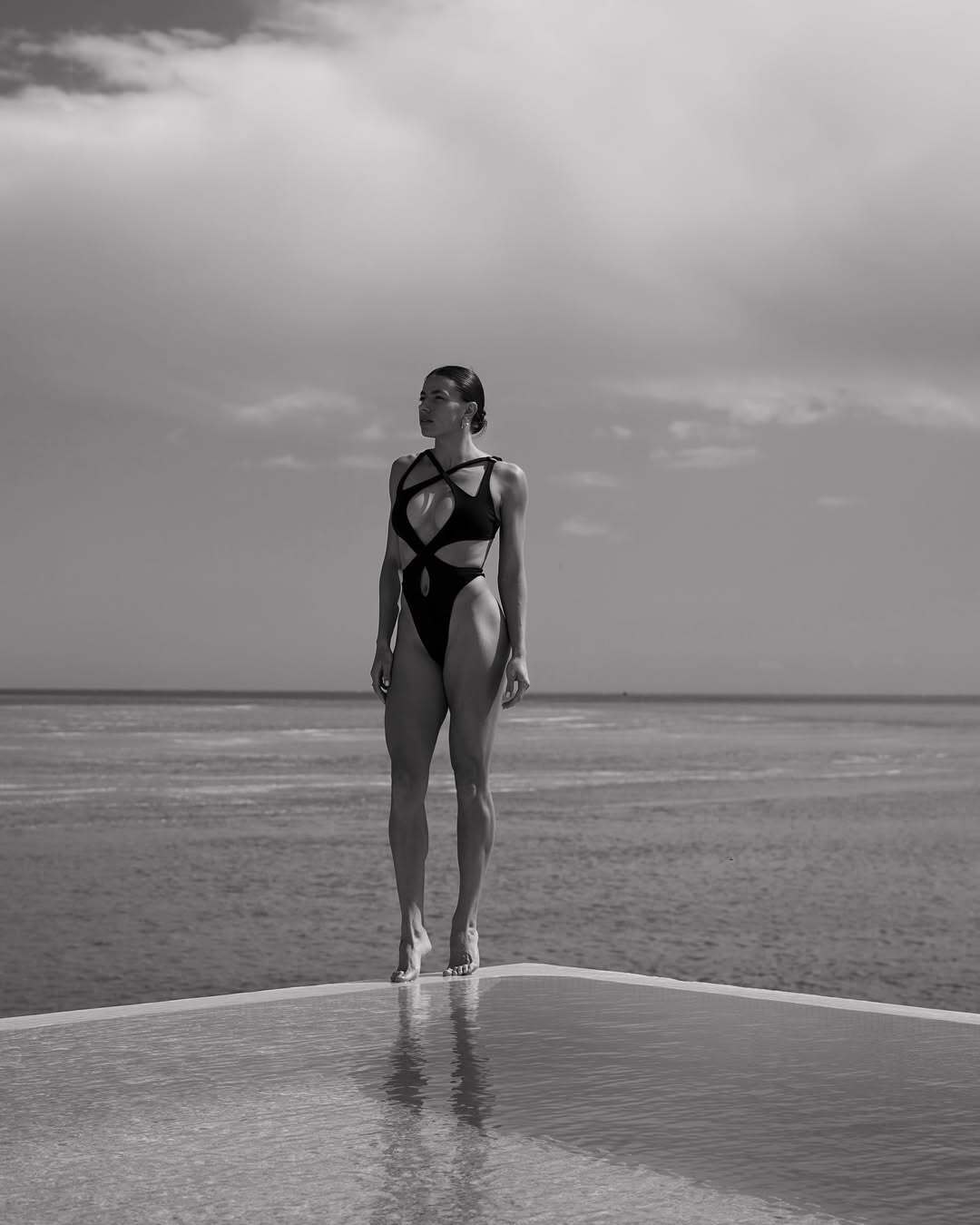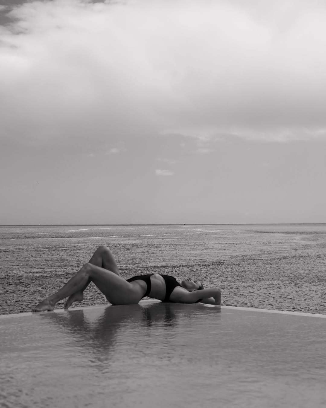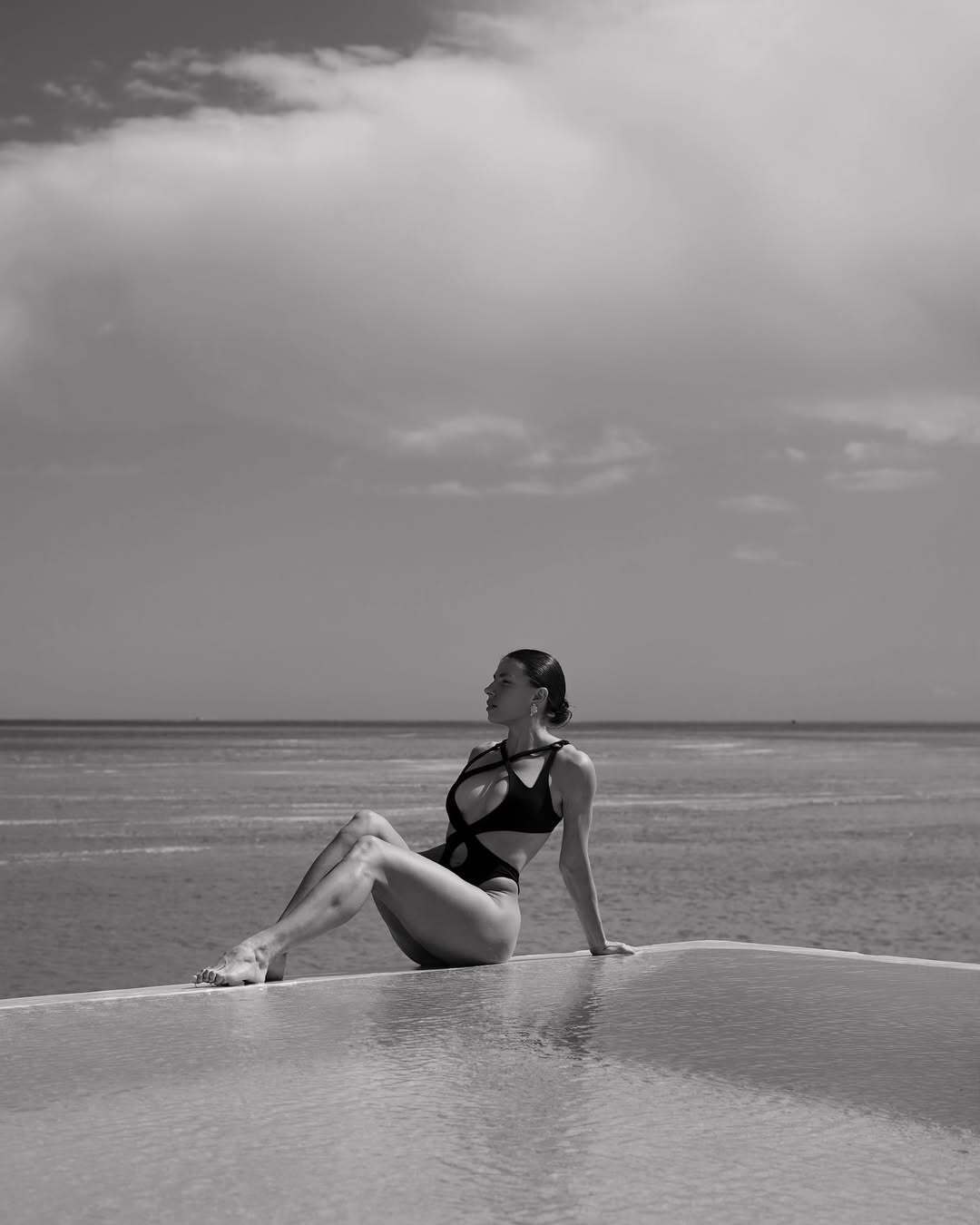 Бех-Романчук оприлюднила чорно-білі знімки. Вона позувала в монокіні складного фасону з перехрещуванням тканини на торсі.