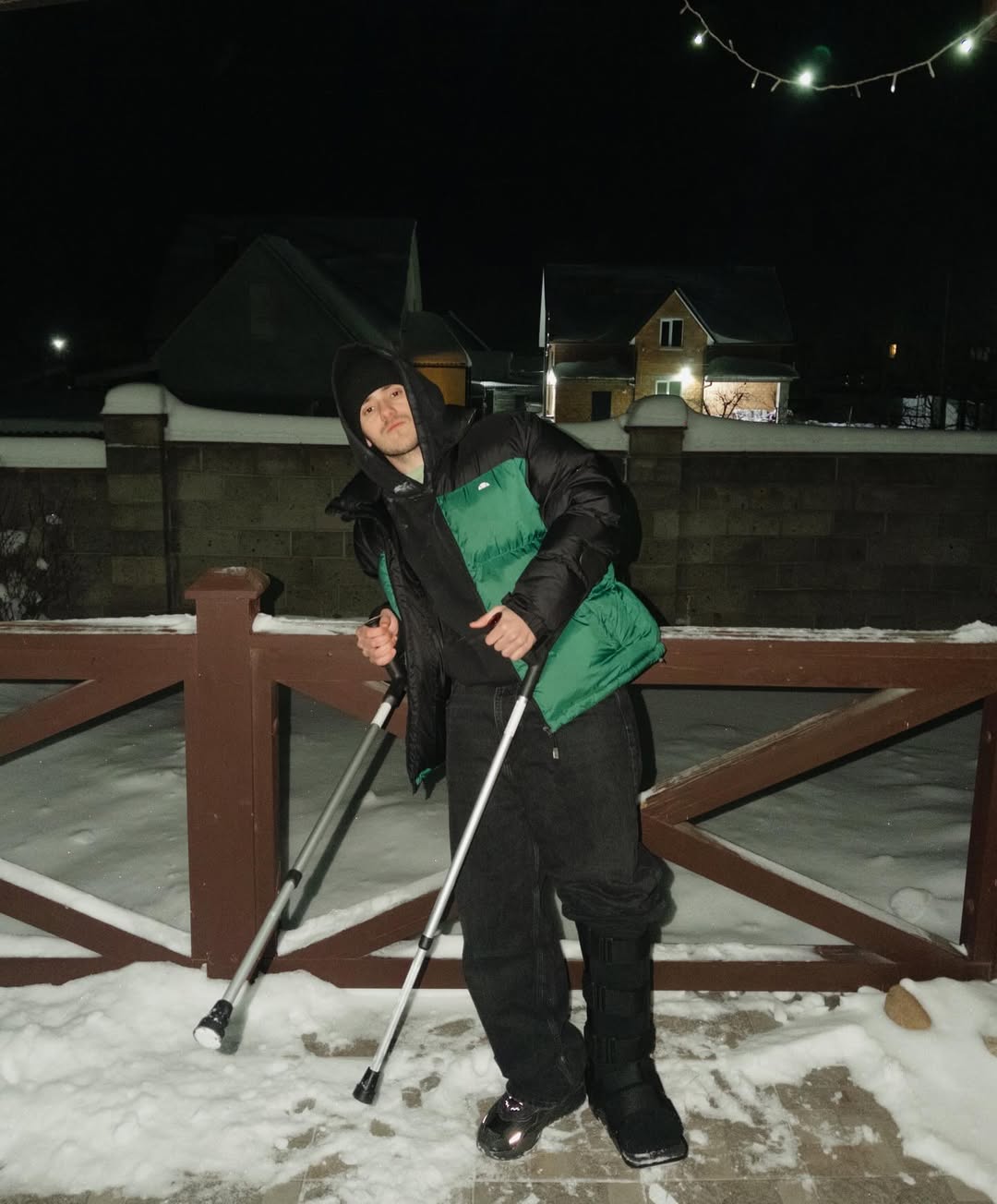 На свіжих фото артист позує із двома милицями посеред засніженого двору.
