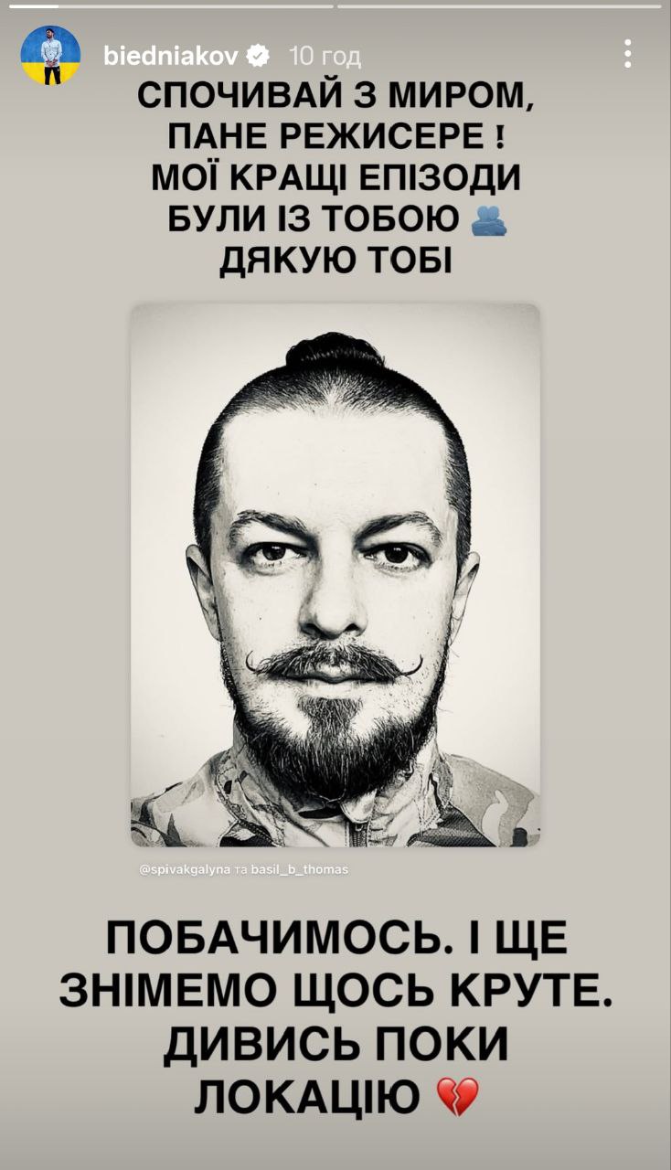 "Спочивай із миром, пане режисере! Мої найкращі епізоди були з тобою. Дякую тобі, – написав Бєдняков. – Побачимося і ще знімемо щось круте. Дивися поки локацію".