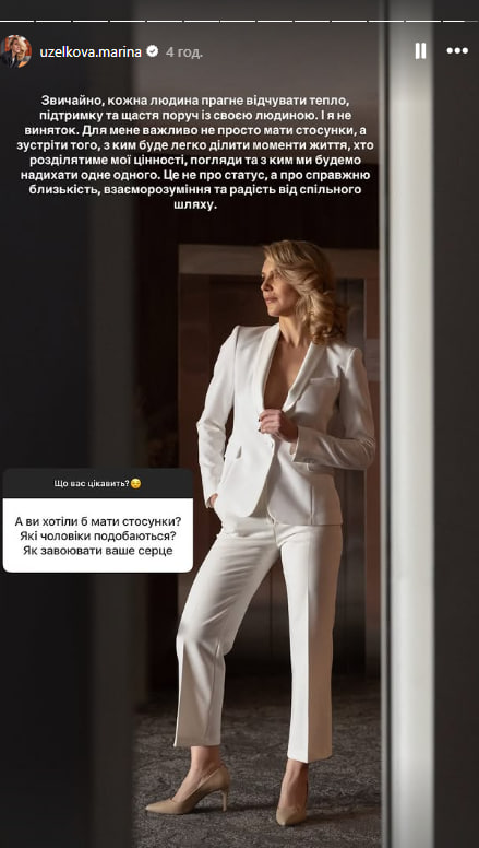 Описуючи стосунки, які їй би хотілося мати, вона зазначила, що кожна людина прагне відчувати тепло, підтримку й щастя поруч зі своєю людиною.