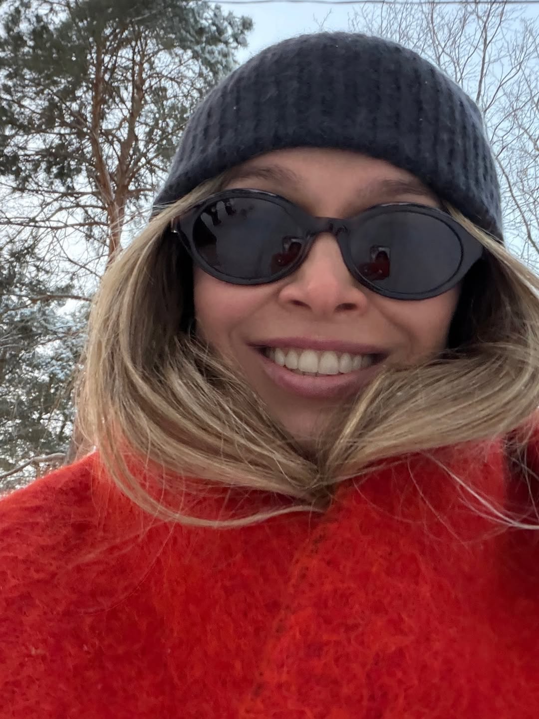 На вулиці Брежнєва знялася в чорній шапці, із червоним об'ємним шарфом на шиї, а також у сонцезахисних окулярах.