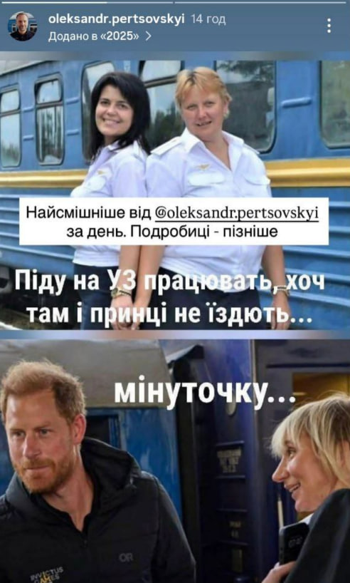 Принц Гаррі приїхав до Києва потягом "Укрзалізниці". Глава компанії Олександр Перцовський пожартував в Instagram Stories, що, працюючи провідницею, є можливість зустріти принца, нехай навіть уже й одруженого.
