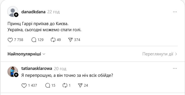 "Пройшла повз рудого високого чоловіка, до нього підійшли люди з камерами та мікрофонами, обернулася, подумала: "Цікаво, що за відома особистість?" Через 30 хвилин заходжу в Threads. Ось так прошльопала принца. Ніколи не знаєш, куди тебе закине доля", – написала в мережі користувачка Олександра Шапранська.