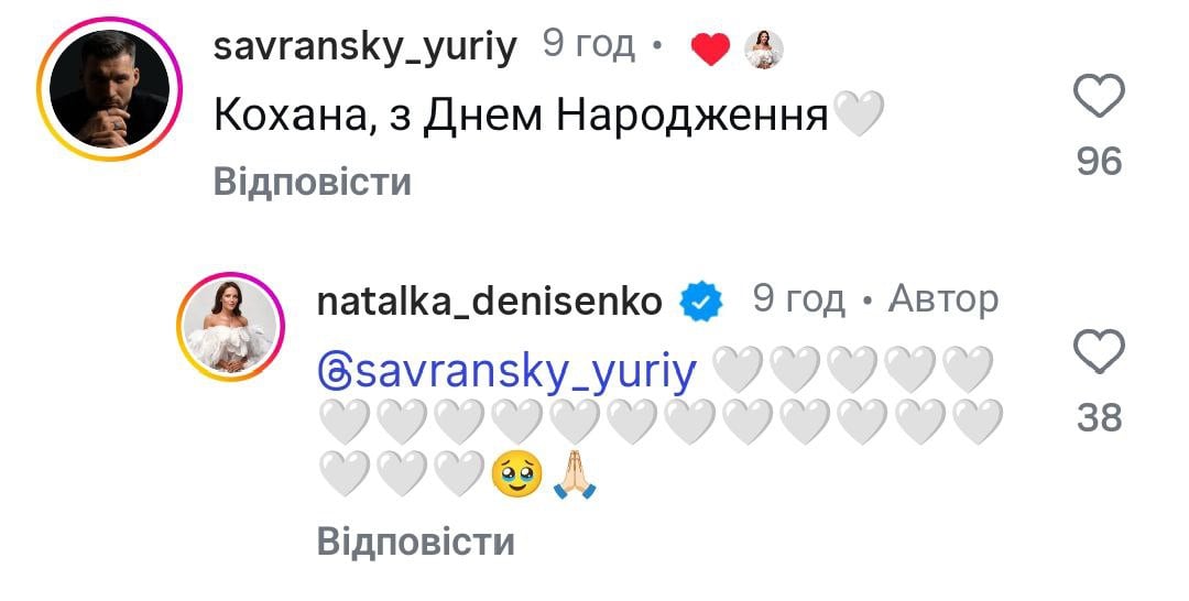 "Кохана, із днем народження", – звернувся він до Денисенко. Актриса відповіла йому великою кількістю емодзі у вигляді сердець.