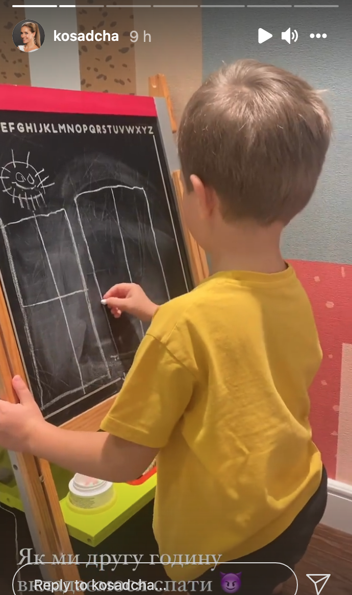 Українська телеведуча Катя Осадча увечері 25 жовтня завантажила в Instagram Stories фотографії свого сімейного вечора. На першому знімку вона показала свого середнього сина Івана, якому за кілька місяців виповниться п'ять років. На фото хлопчик щось малює крейдою на дошці.