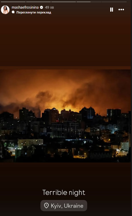 Ведуча Маша Єфросиніна розмістила в Instagram Stories фото Києва, охопленого вогнем після обстрілів.