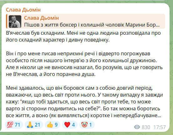 Український ведучий Слава Дьомін 9 листопада в Telegram прокоментував смерть українського боксера В'ячеслава Узелкова, який помер на 46-му році життя.