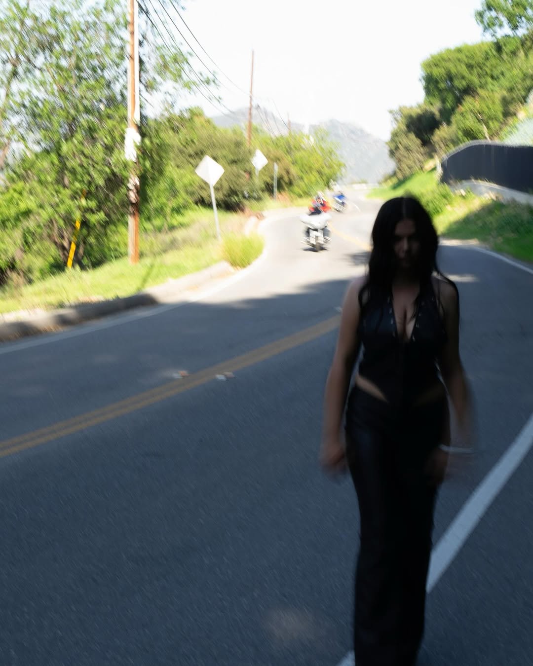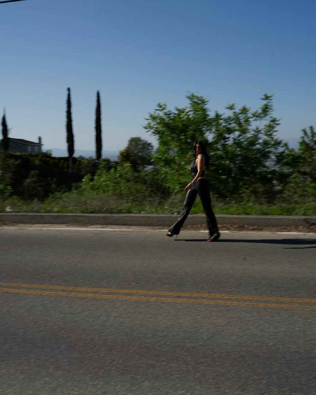 Вона позувала на дорозі, а також на тлі краєвидів із будинками. Дівчина позначила локацію: пагорби Голлівуду.