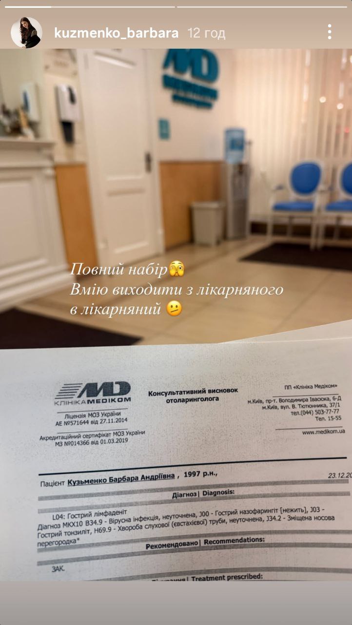 Дочка покійного українського співака Кузьми Скрябіна (Андрія Кузьменка) Марія-Барбара Кузьменко 23 грудня в Instagram Stories показала лікарняну довідку із цілою низкою діагнозів.