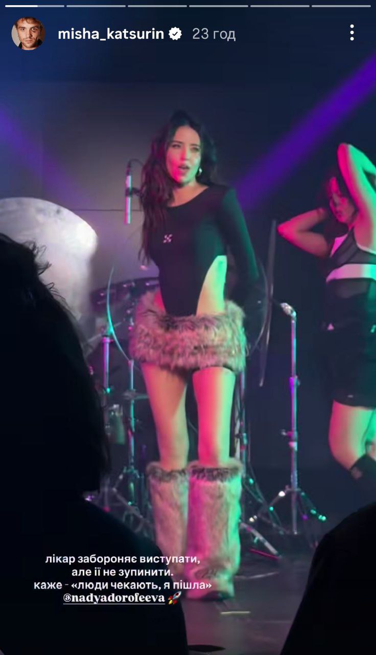 Українська співачка Надя Дорофєєва попри заборону лікарів виступати на сцені таки дала сольний концерт. Про це 21 лютого в Instagram Stories розповів її чоловік, український ресторатор Михайло Кацурін.
