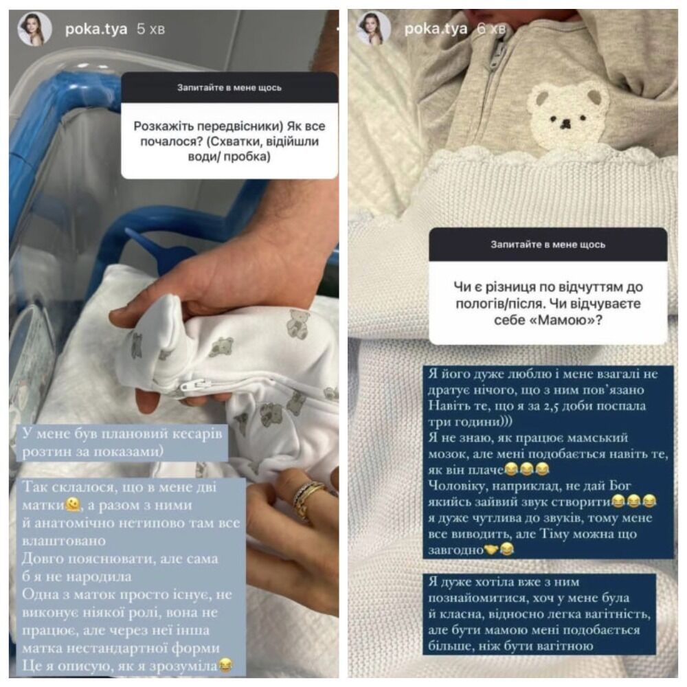 "У мене був плановий кесарів розтин за показами. Так склалося, що в мене дві матки, а разом із ними анатомічно нетипово там усе влаштовано. Довго пояснювати, але сама б я не народила, – розповіла вона. – Одна з маток просто існує, не виконує ніякої ролі, вона не працює, але через неї інша матка нестандартної форми. Це я описую, як я зрозуміла".
