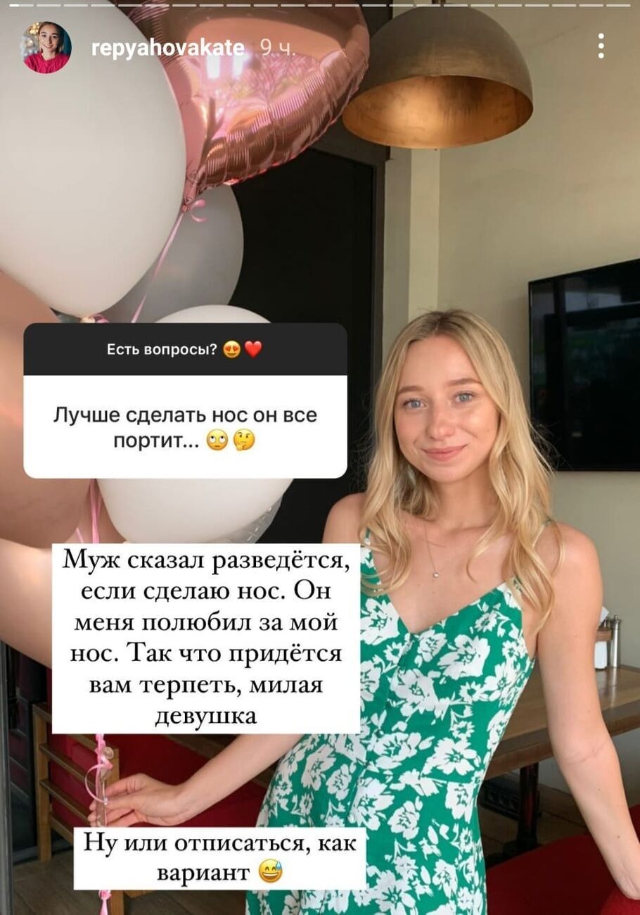 Дружина українського співака Віктора Павліка, блогерка і його концертна директорка Катерина Репяхова 30 вересня, відповідаючи на запитання фоловерів у Instagram Stories, зізналася, що не має наміру змінювати форму свого носа.