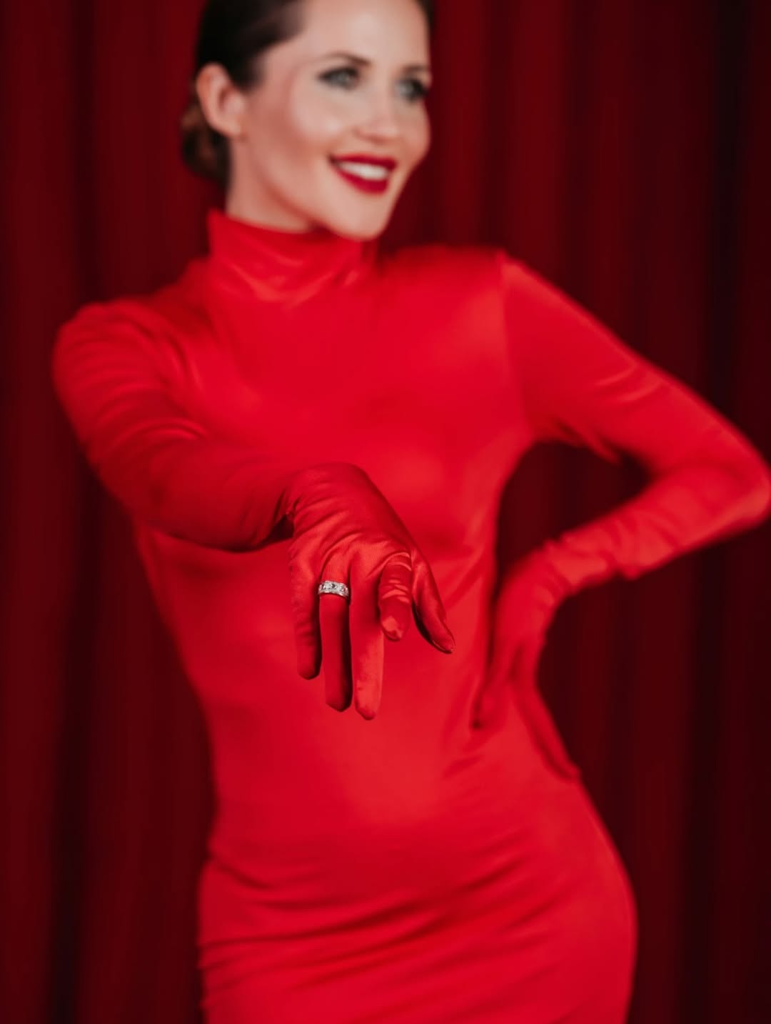 Денисенко постала в червоній сукні, яка підкреслює фігуру, а також у червоних рукавичках. Образ вона доповнила червоною помадою. Фото було зроблено для презентації каблучки іменної ювелірної лінії Денисенко.