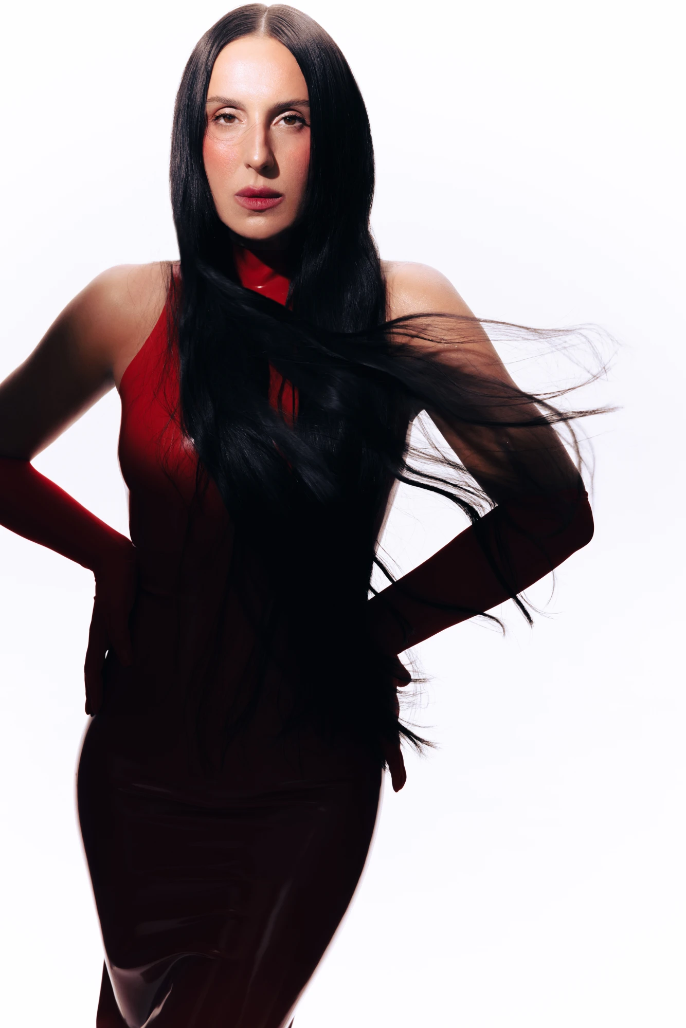 На знімках з нової фотосесії Джамала позує в обтислих латексних боді й спідниці червоного кольору.