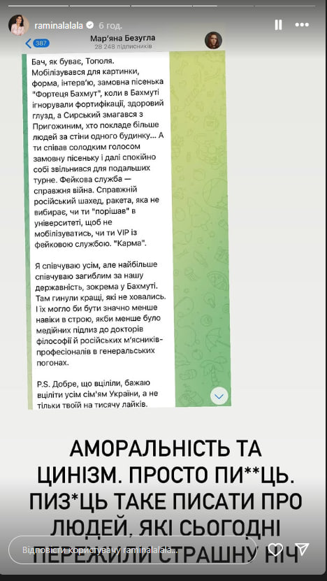 Українська журналістка Раміна Есхакзай 23 червня в Instagram Stories назвала аморальним і цинічним висловлювання нардепки Мар'яни Безуглої на адресу українського артиста Тараса Тополі.