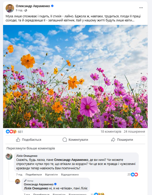 "Муха лише споживає і гидить, її стихія – лайно. Бджола ж, навпаки, трудиться, плоди її праці солодкі, та й середовище її – запашний квітник. Хай у нашому житті будуть лише квіти", – написав він.