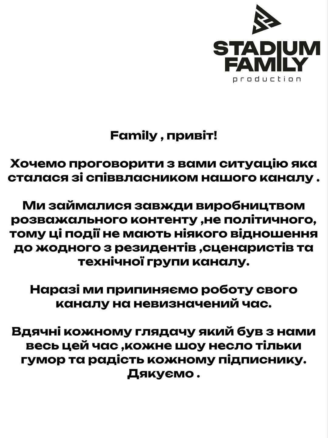 Повідомляють, що канал припиняє роботу на невизначений час.