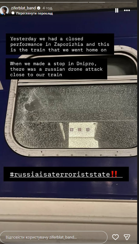 "Учора в нас був закритий концерт у Запоріжжі, і ось цим поїздом ми поверталися додому. Коли ми зупинилися у Дніпрі, поруч із нашим поїздом сталася атака російського безпілотника", – написали артисти.
