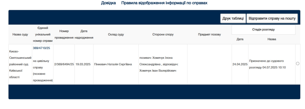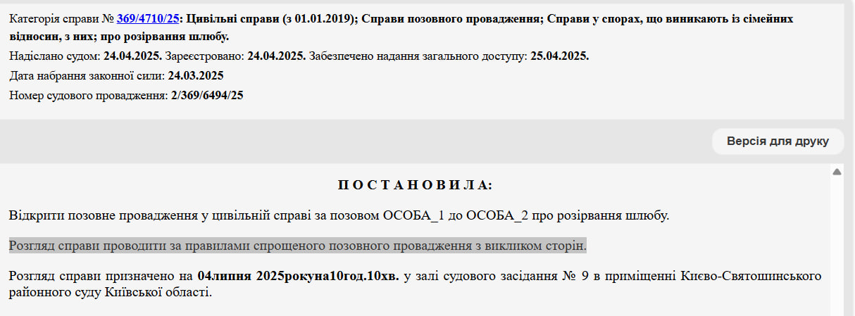 Судову справу про розлучення №369/4710/25 розглядатимуть у Києво-Святошинському районному суді 4 липня.
