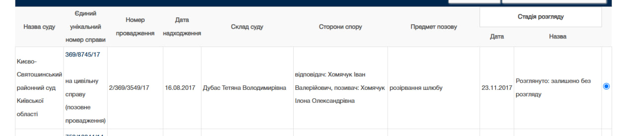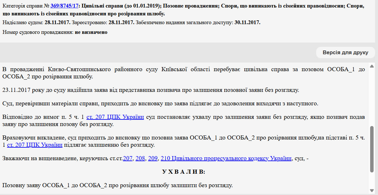 У реєстрі судових рішень вказано, що 24 березня суд ухвалив рішення відкрити провадження про розірвання шлюбу, а розгляд справи проводити за правилами спрощеного позовного провадження з викликом сторін.