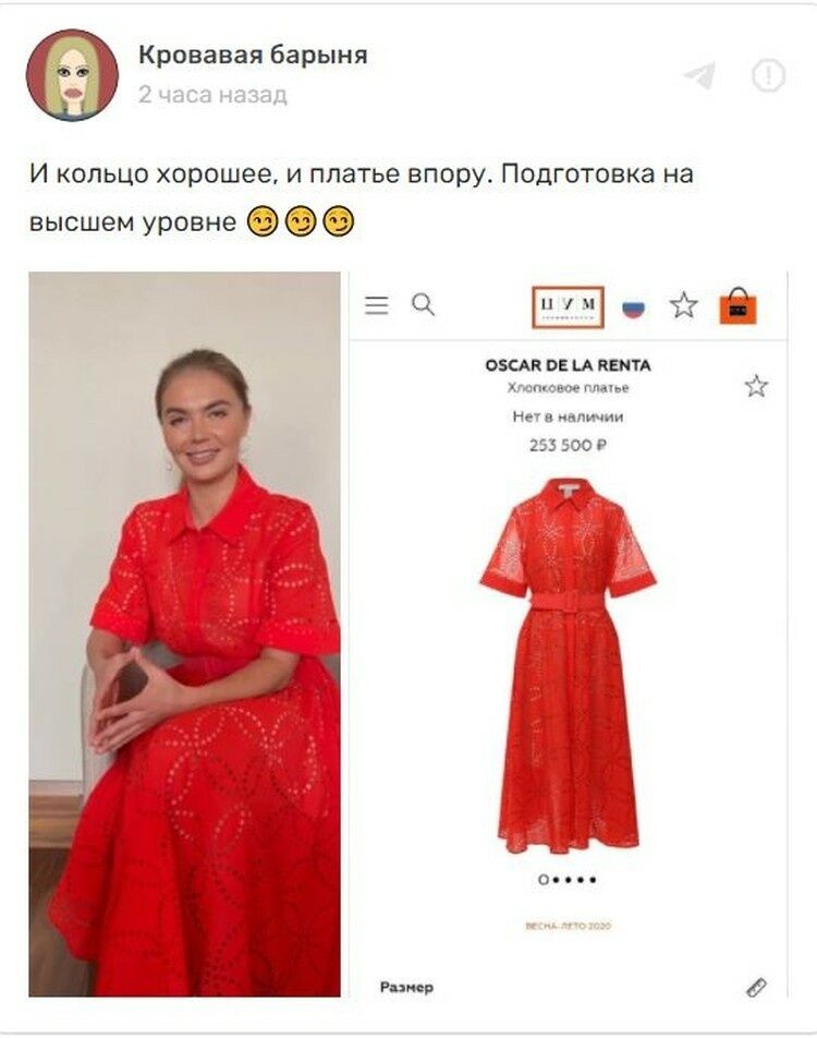 Собчак поєднала скріншот зображення Кабаєвої зі скріншотом сайта американського бренда Oscar de la Renta, на якому розміщено фото вбрання, дуже схожого на вбрання спортсменки. На сайті вказано, що вартість такої сукні становить 253 тис. руб. (приблизно 93 тис. грн).