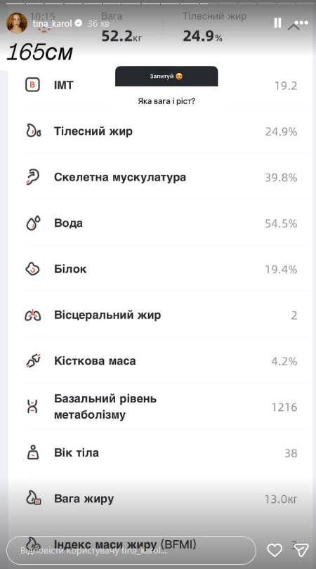 Тіна Кароль зазначила, що зараз за зросту 165 см важить трохи більше ніж 52 кг.