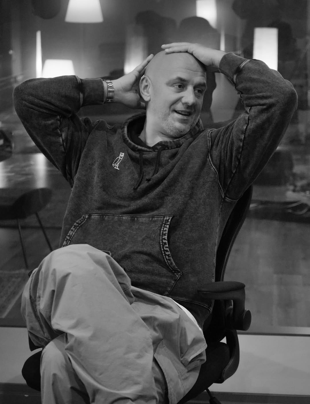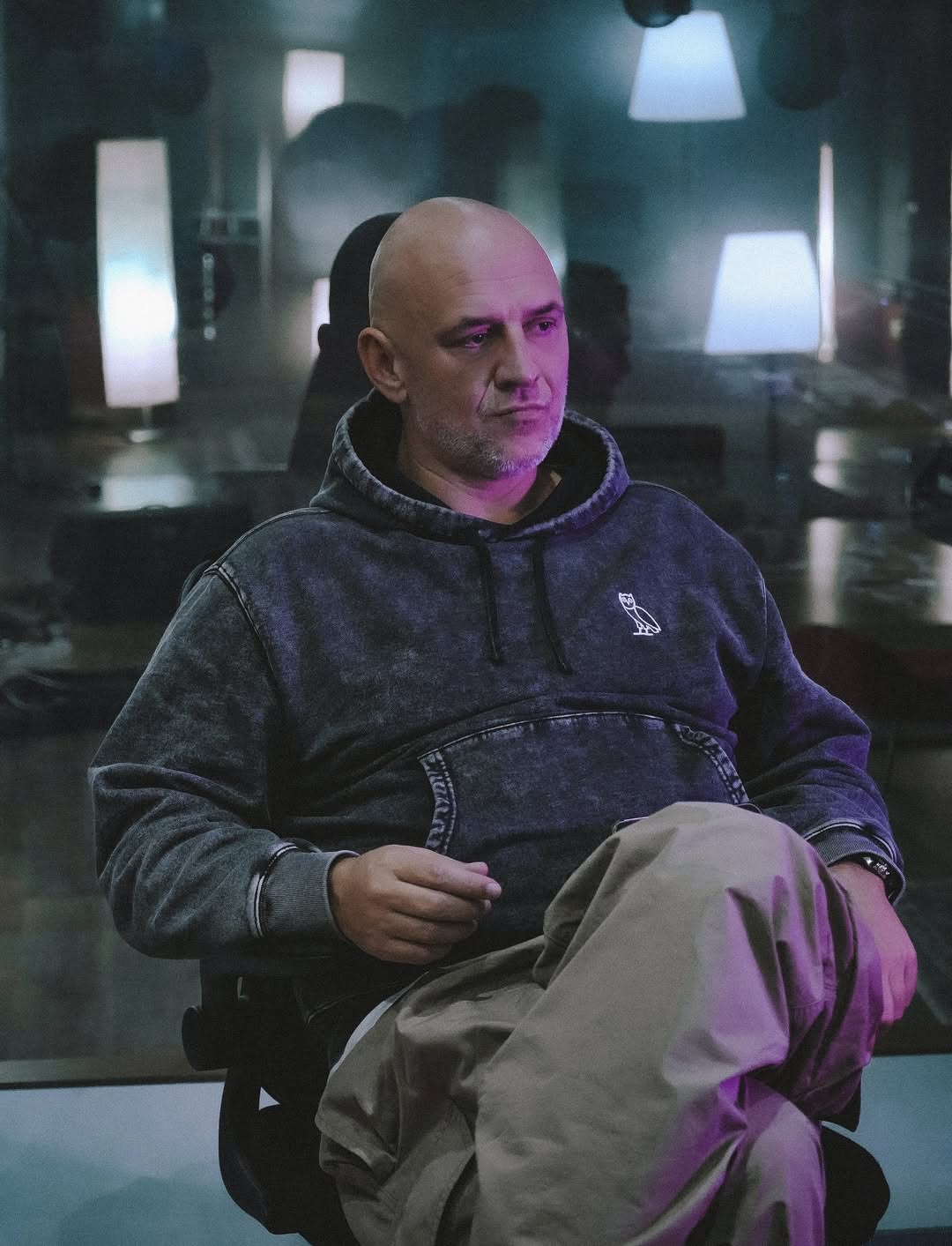 Репер і продюсер позував у сірому худі з капюшоном і світло-коричневих джинсах. На обличчі він засвітив помітну щетину.