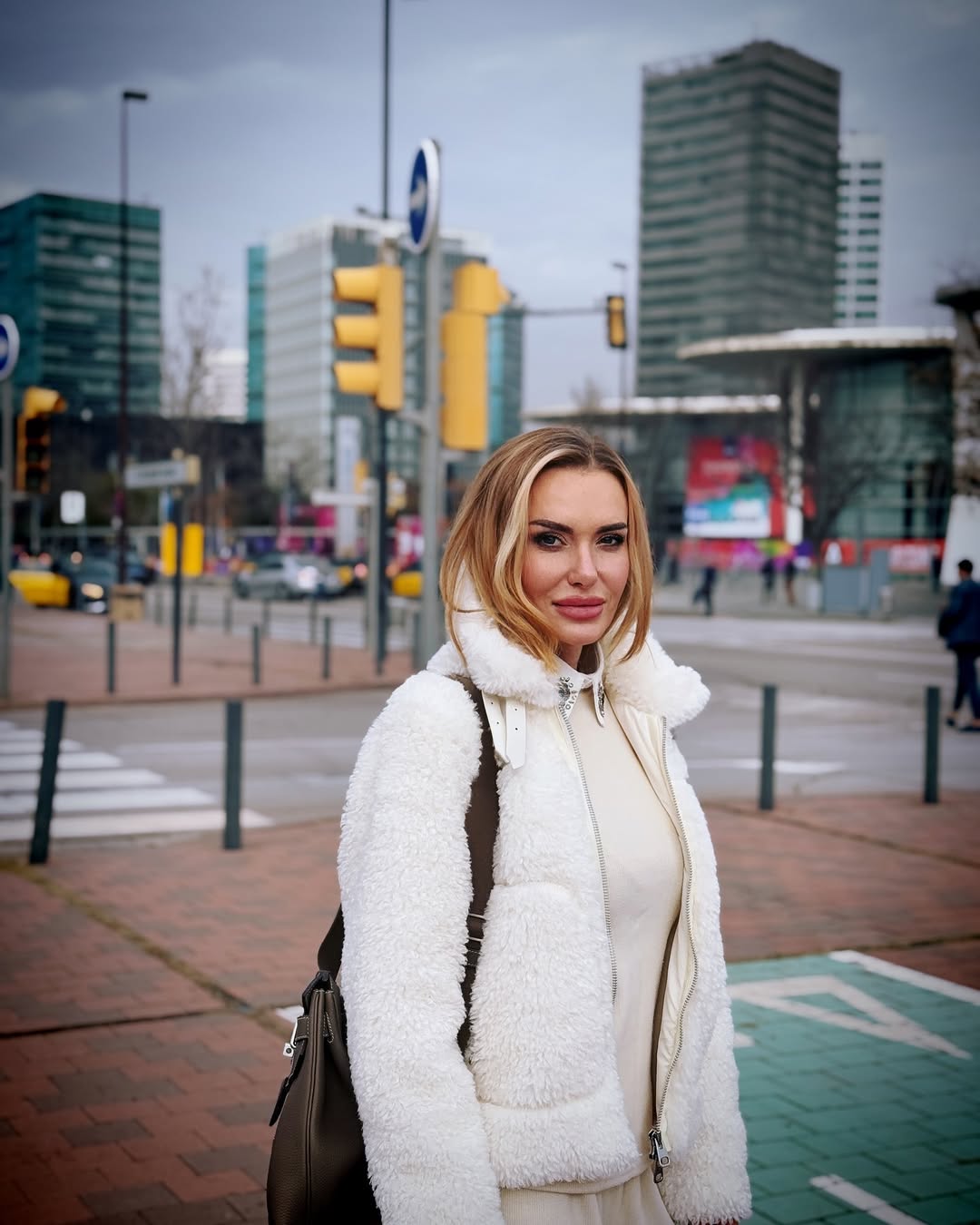 Камінську зняли на вулиці, на тлі висотних будівель. Вона була в короткій білій шубі.
