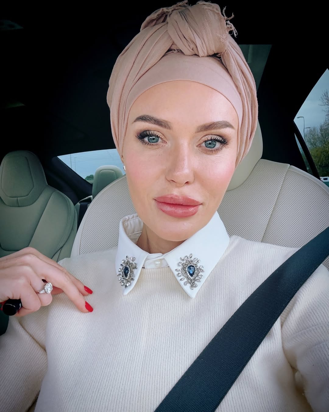 Ще на одному фото Камінська позує із чалмою на голові. Також співачка засвітила червоний манікюр і каблучку на безіменному пальці. Камінська знялася в салоні автомобіля.