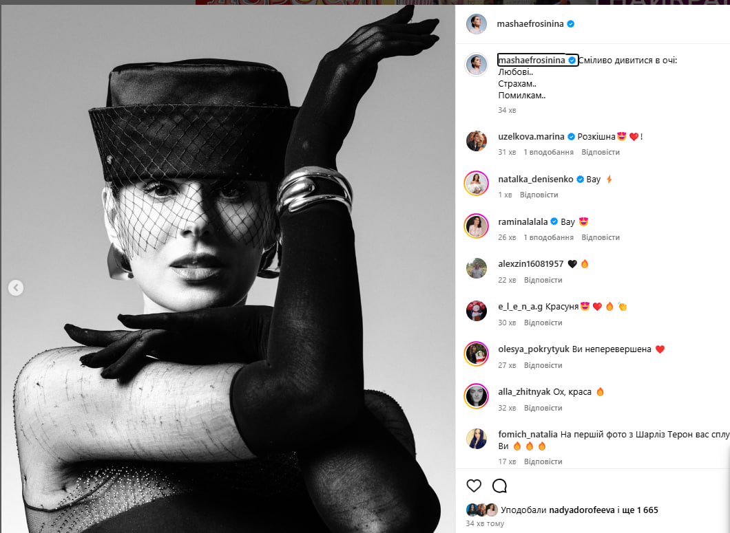 На фото Єфросиніна позує в чорному капелюсі з вуаллю й чорних рукавичках. Знімки ведучої в новому образі викликали захоплення у представників українського шоу-бізнесу.