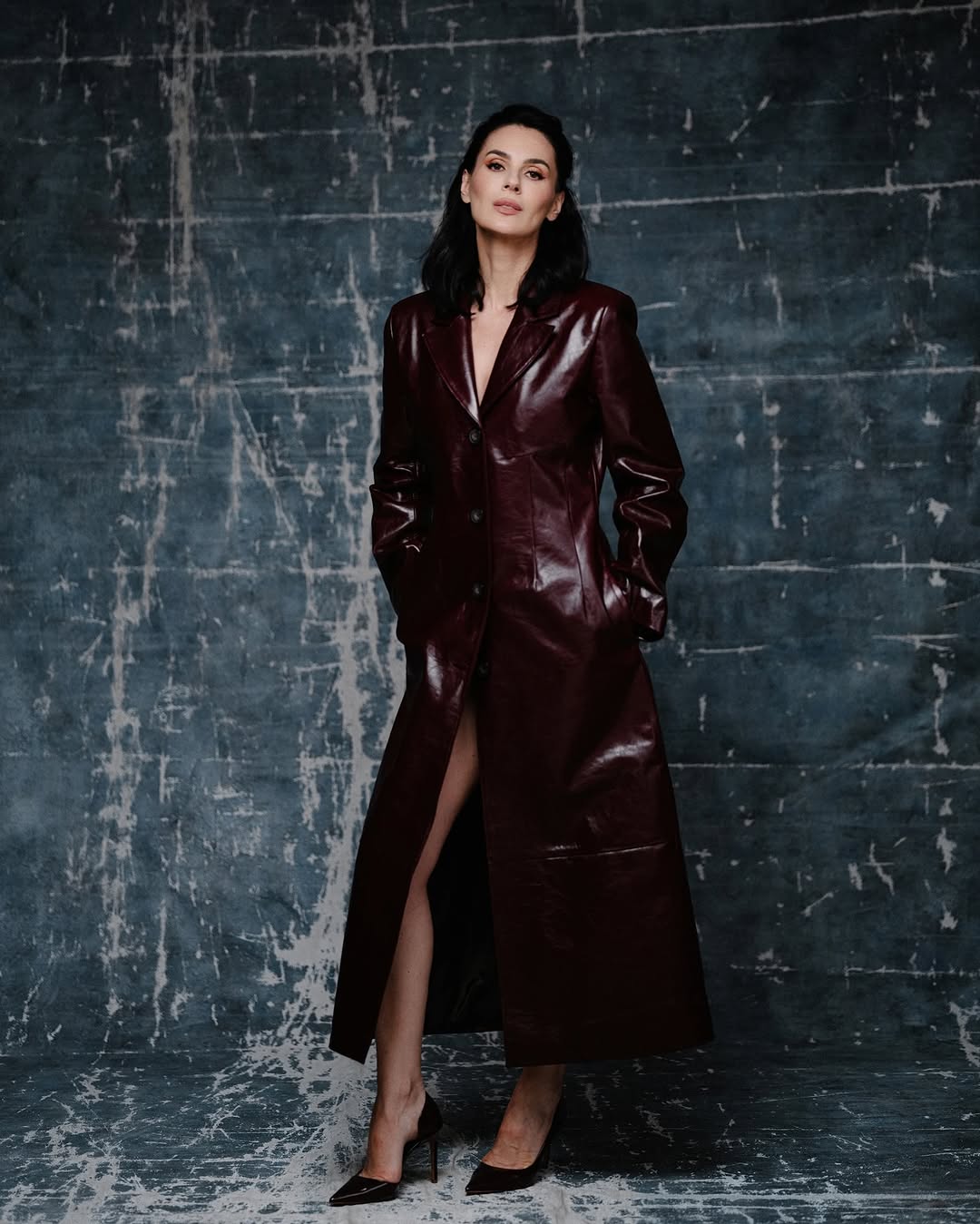Телеведуча постала на знімках на повний зріст. Вона позувала в довгому шкіряному плащі кольору бургунді. Образ вона доповнила чорними черевиками на високих підборах.