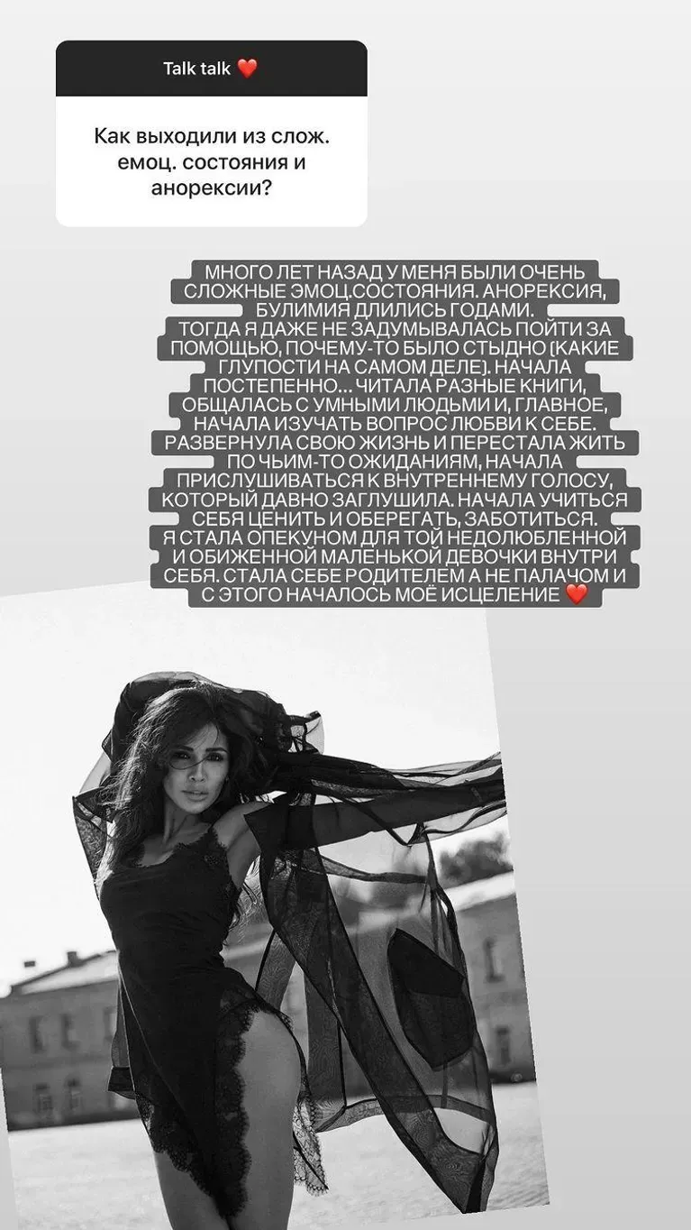 "У 15 років мій стабільний психічний стан дав збій. Єдине, що я могла зробити, – це зупинити сльози й перестати їсти. Місяць тривав мій бойкот їжі. Я сприймала кожен шматочок хліба, м'яса чи інших продуктів ворогом свого тіла. Через місяць завдяки знайомій, яка просто вмовила мене спробувати з'їсти трохи каші, я дізналася, що мій організм перестав приймати їжу, – написала вона. – Так, я схудла на 11 кг. Так, я подобалася собі в дзеркалі, але вся ситуація цього не варта. Моїм найкращим другом була вбиральня, у якій я плакала через те, що не можу себе зупинити. Вечеряючи вдома, я тремтячими руками їла салат і сварила себе за кожну з'їдену ложку, а потім бігла зважуватися, сподіваючись, що цифра не змінилася".