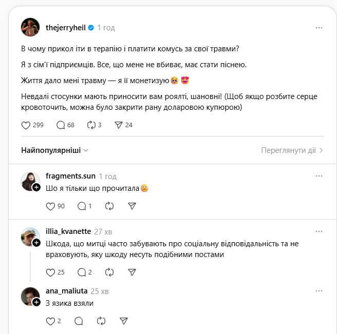 "Шкода, що митці часто забувають про соціальну відповідальність і не враховують, яку шкоду несуть подібними постами", – відреагували підписники.