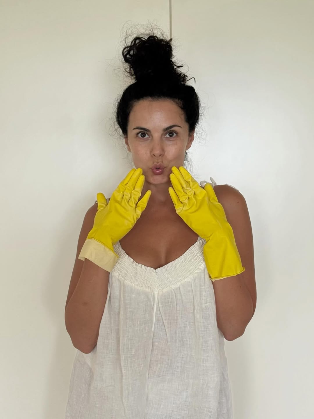 Рожеву сукню й чорні рукавички в домашньому варіанті Каменських замінила на футболку й гумові рукавички, склавши губи "качечкою".