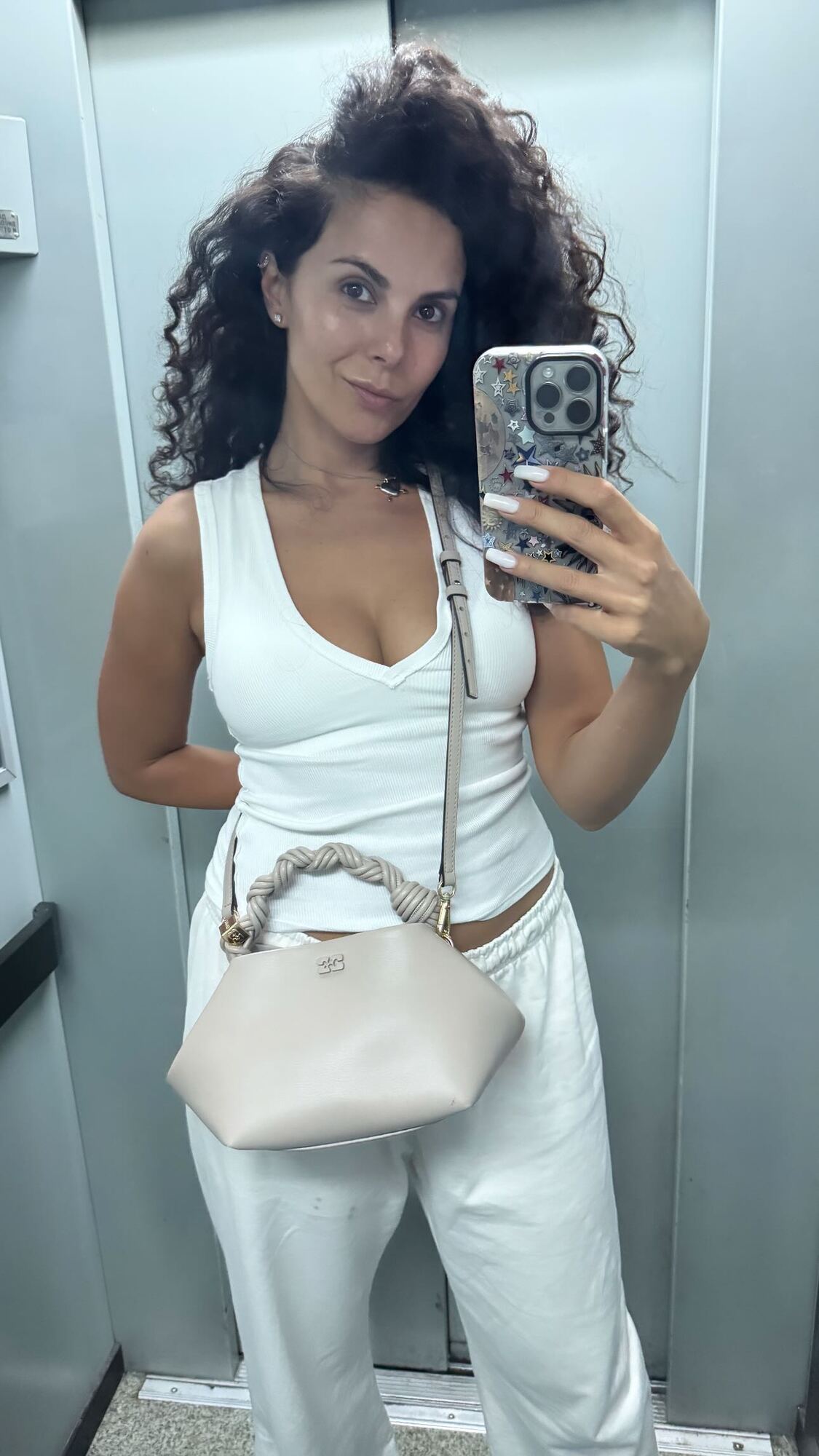 Каменських постала в білому топі-майці, а також у білих штанах.